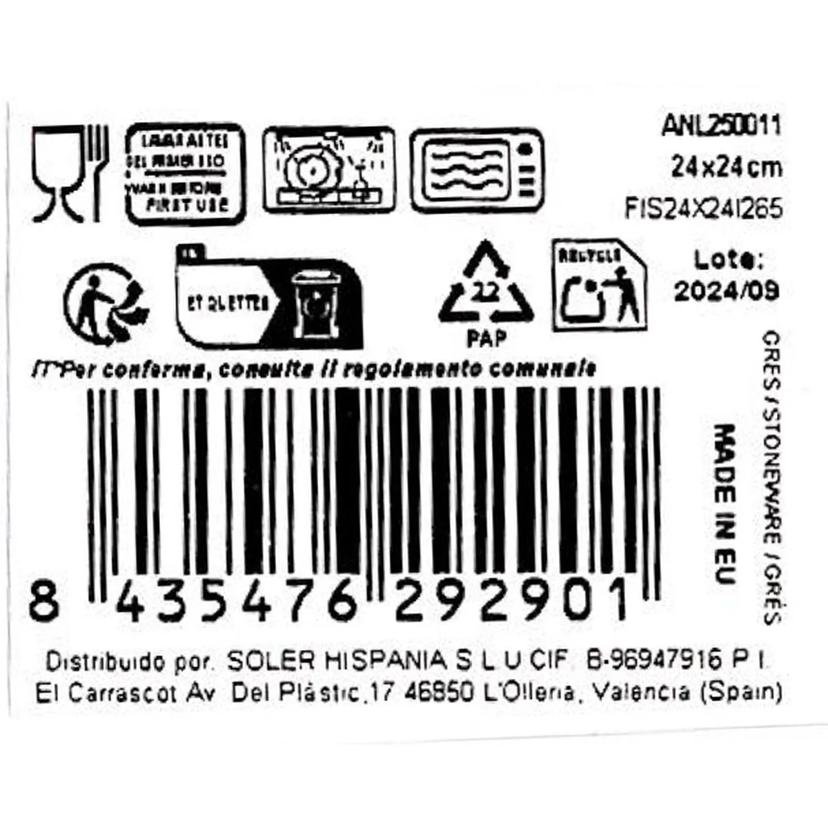 ASSIETTE PLATE LA MEDITERRÁNEA ANLLO 24 X 24 X 2 CM (6 UNITÉS)