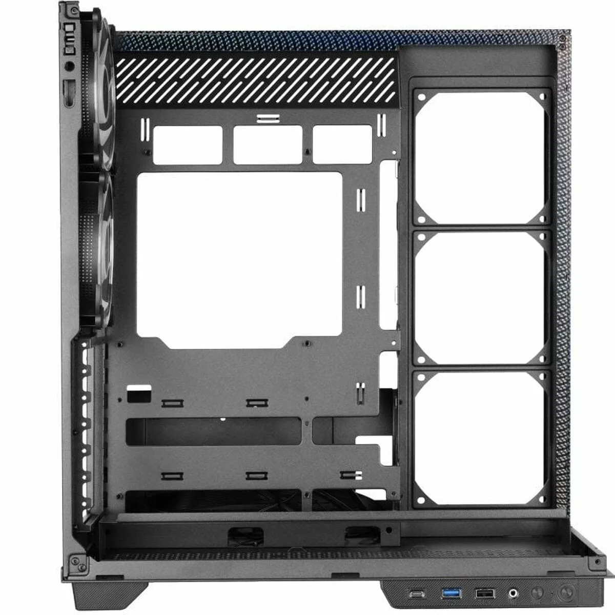 - Refroidissement optimisé grâce à une circulation d’air fluide et des supports pour ventilateurs 120 mm (jusqu’à 3 avant, 1 arrière).