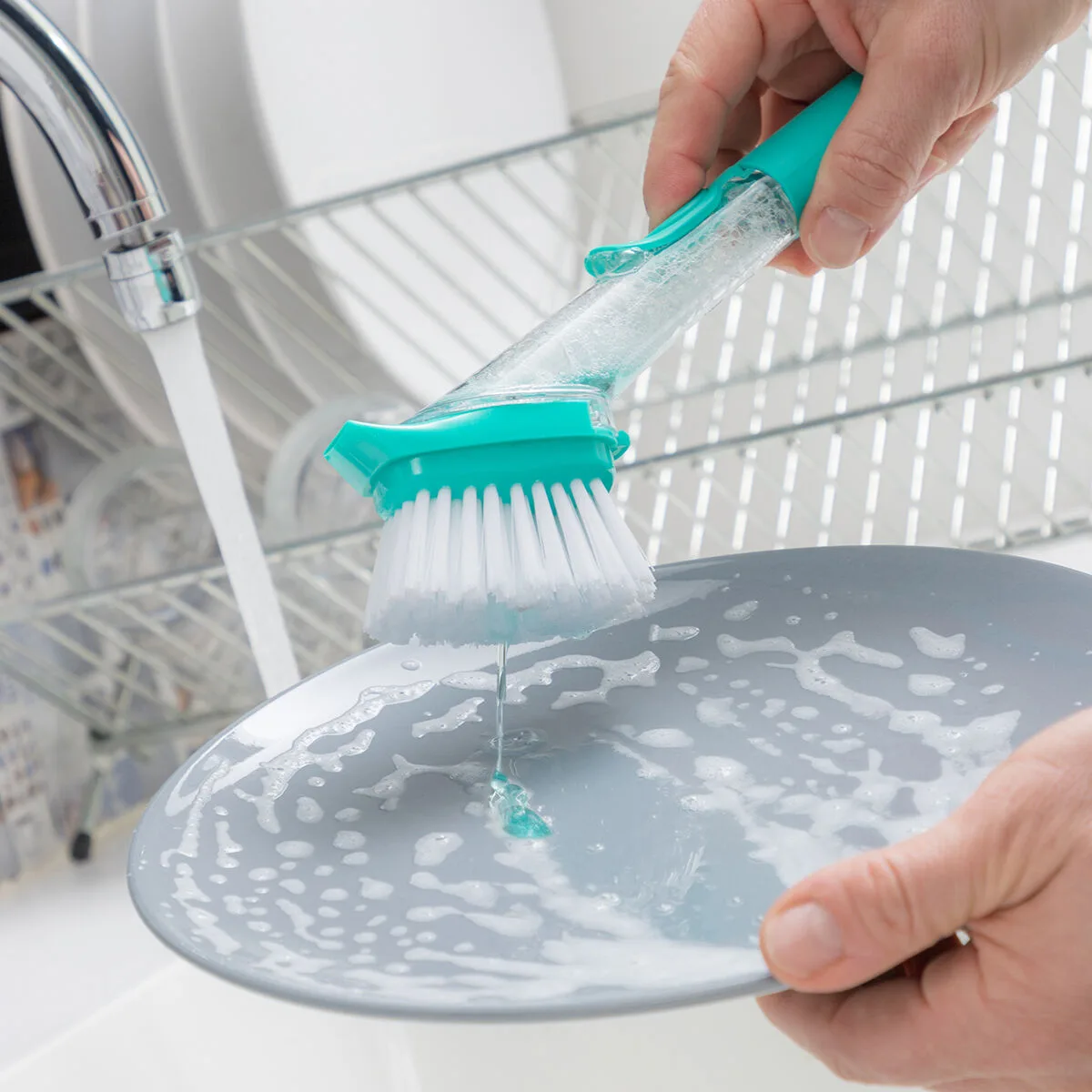 - Características: Mango rellenable de lavavajillas con botón dispensador